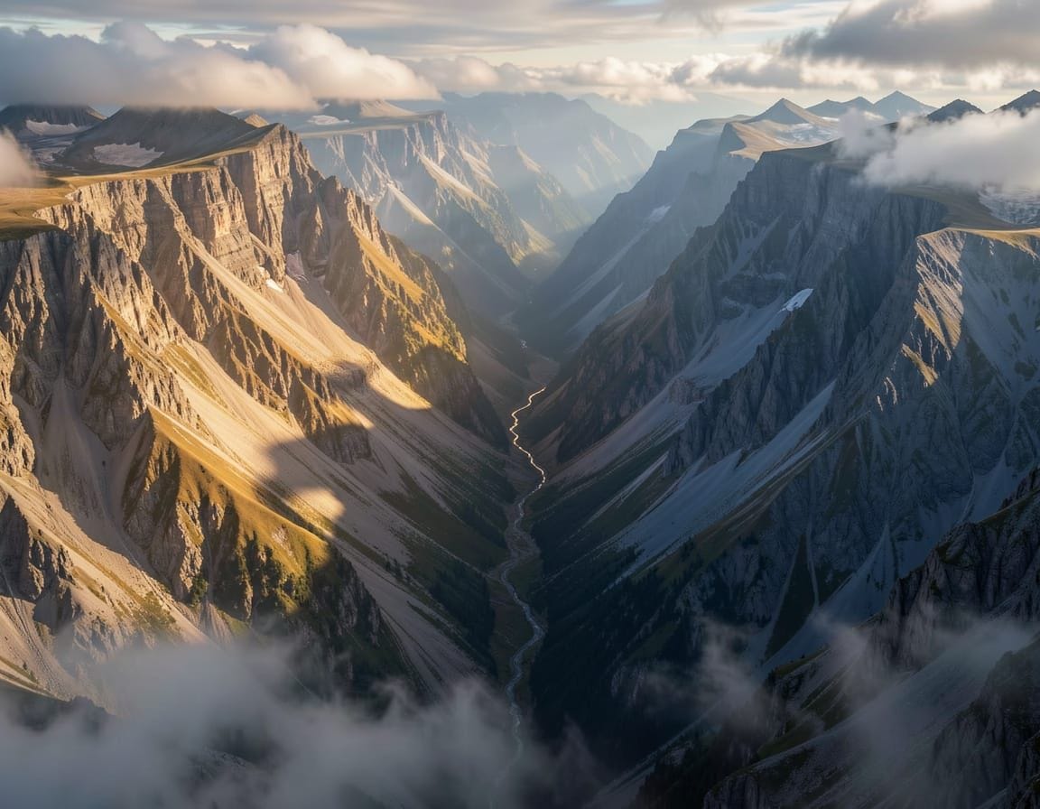 Prompt: Two deep valleys separated by high ridges in a vast mountainous landscape. Between two valleys, a single narrow defile — a mountain pass — cuts through the ridge, barely visible unless viewed from exactly the right angle. The lighting is dramatic, with one valley in warm golden light and the other in cool blue shadow. viewed from above at an angle. The pass itself catches a thin line of light suggesting traversability. The terrain should look ancient, weathered, geological — not fantastical or science fiction. No text, no figures, no symbols. Photorealistic or high-quality digital painting style. Atmospheric, with mist or clouds partially obscuring the deeper valleys, suggesting topology that extends beyond what’s immediately visible.